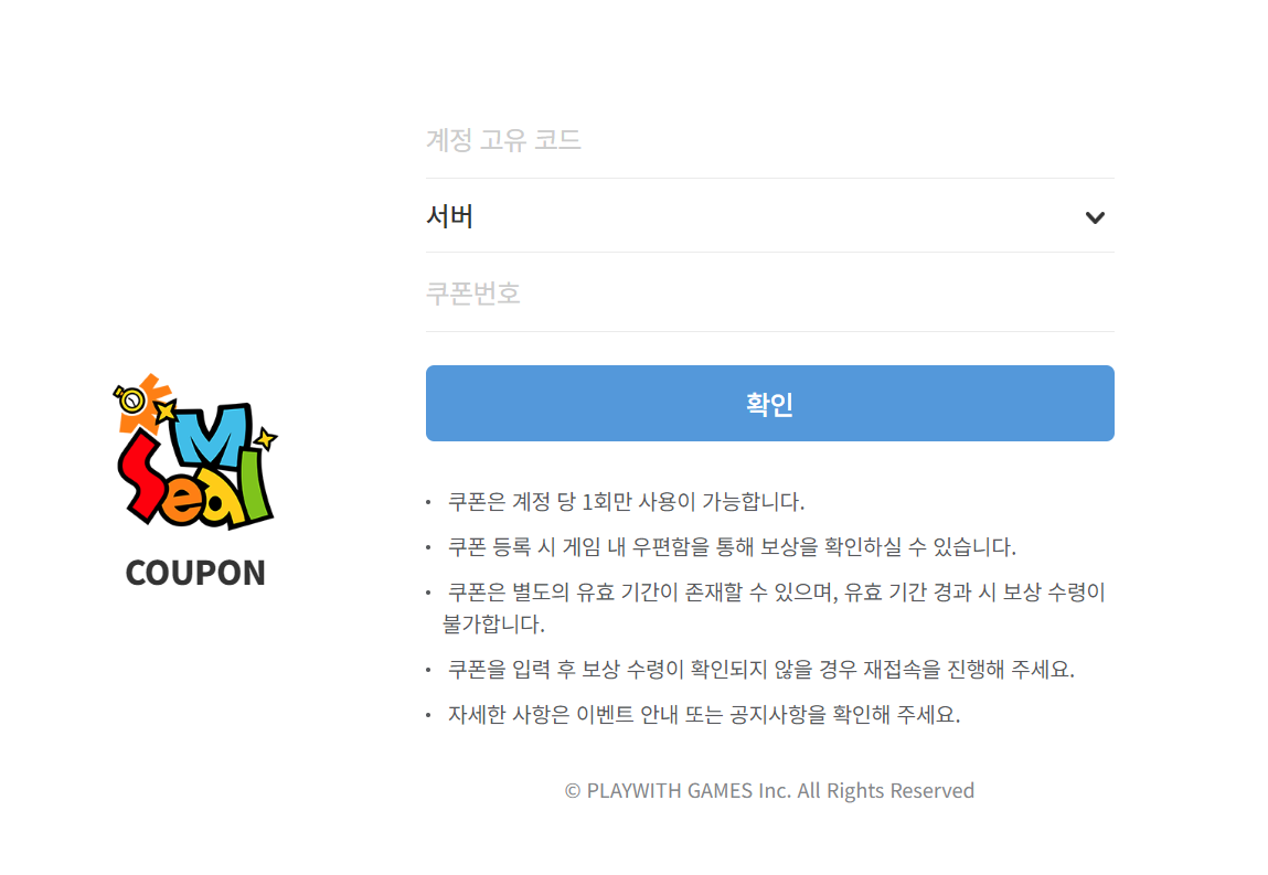 - 본 쿠폰은 계정 당 1회만 사용 가능하며, 중복하여 보상을 수령 받을 수 없습니다.