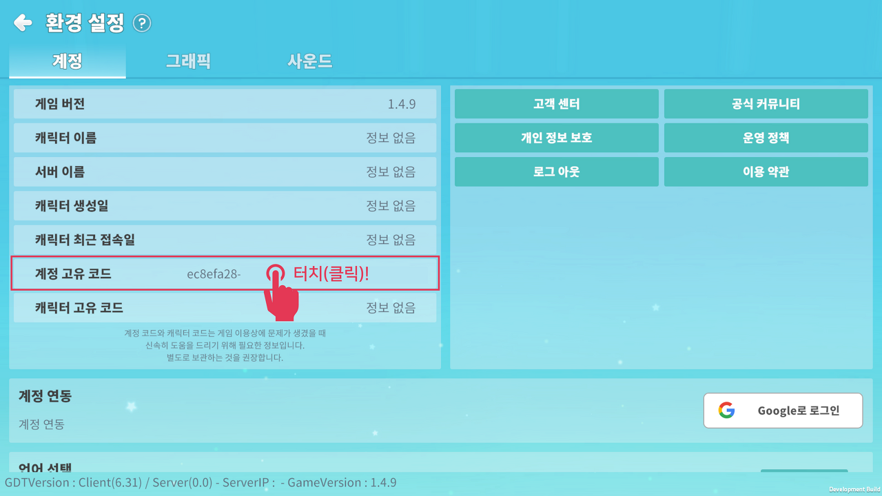 STEP1. 계정 고유 코드는 게임 내 환경설정에서 확인하실 수 있습니다.