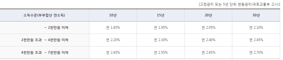* 주거 전용면적이 85㎡(수도권을 제외한 도시지역이 아닌 읍 또는 면 지역 100㎡) 이하 주택으로 대출 접수일 현재 담보주택의 평가액이 5억원(신혼가구 및 2자녀 이상 가구 6억원) 이하인 주택